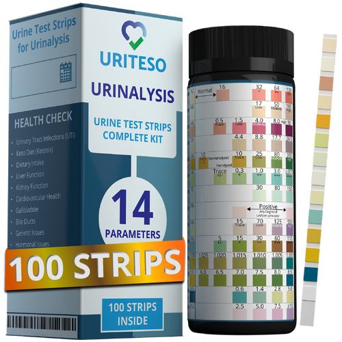 URITESO 14 Parameter Full Panel Urine Test Strips for Urinalysis | 100 Strips - Testing Kit for Kidney, Liver, UTI, Keto Diet, Ketosis, Hydration, Proteinuria - RBC, PRO, BIL, PH, SGR, CRE, KET, SG +6 More